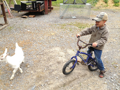Checking out the baby goats at his cousin's house.