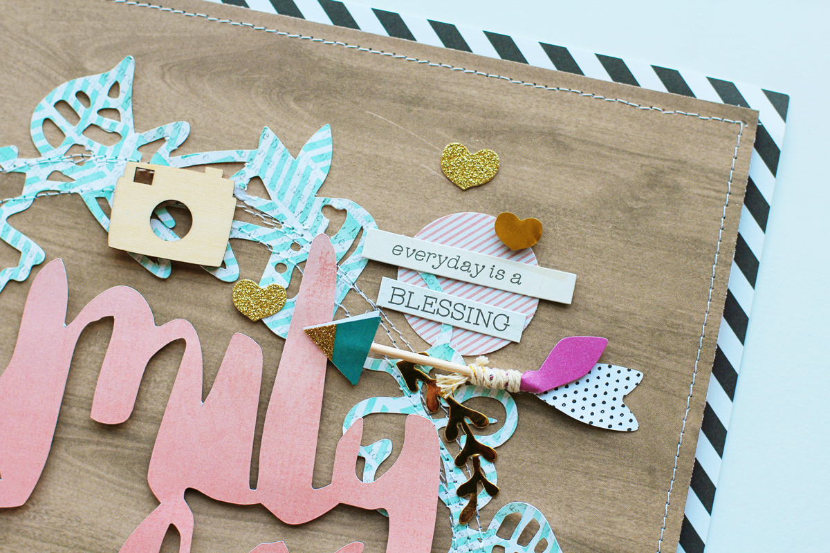 I added my photos around the title and arranged them so they created a visual triangle. I also added lots of embellishments around the wreath to balance out my overall design.