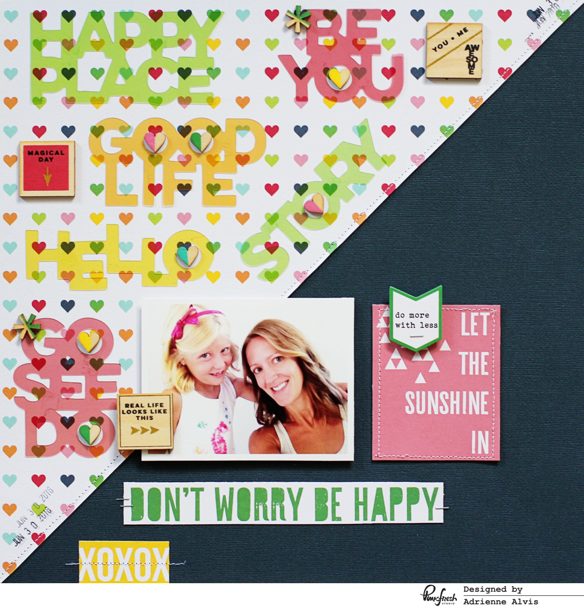I used lots of bits and pieces from both the Life Noted and Felicity Collections for this page. I started by placing the diagonally cut heart patterned paper on top of a piece of navy card stock. I just love the contrast of the dark vs. light paper! I think it makes the other embellishments and the photo of me and my daughter after we got fresh haircuts and do's really pop!