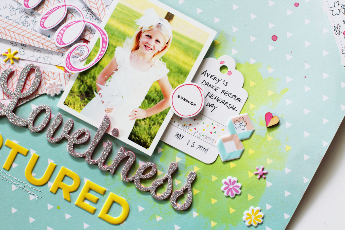 I fussy-cut a bunch of patterned paper pieces from the Felicity 6x6 paper pad and tucked them under the photo of my daughter getting ready to attend her dance recital dress rehearsal this past spring.