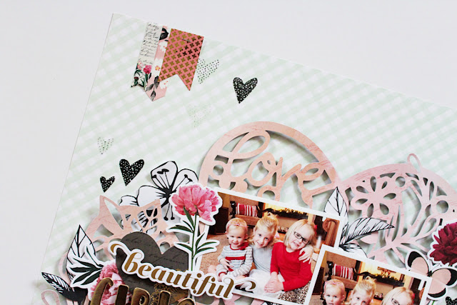 For my next layout, I used a piece of light pink cardstock for my background instead of my usual white. The pink pops against the colors of the patterned paper from the Dream On collection so well!