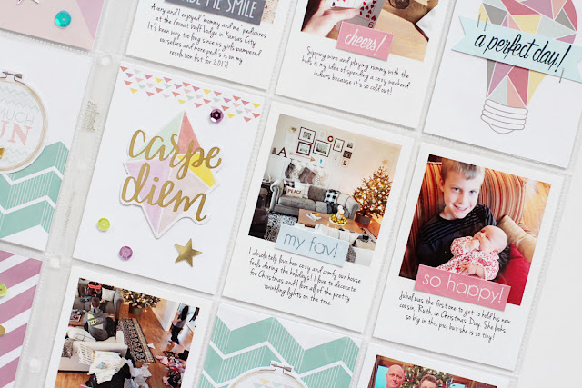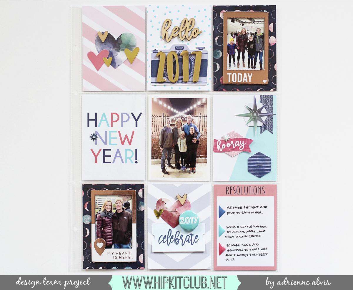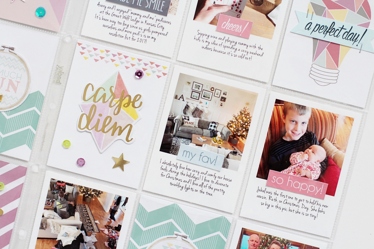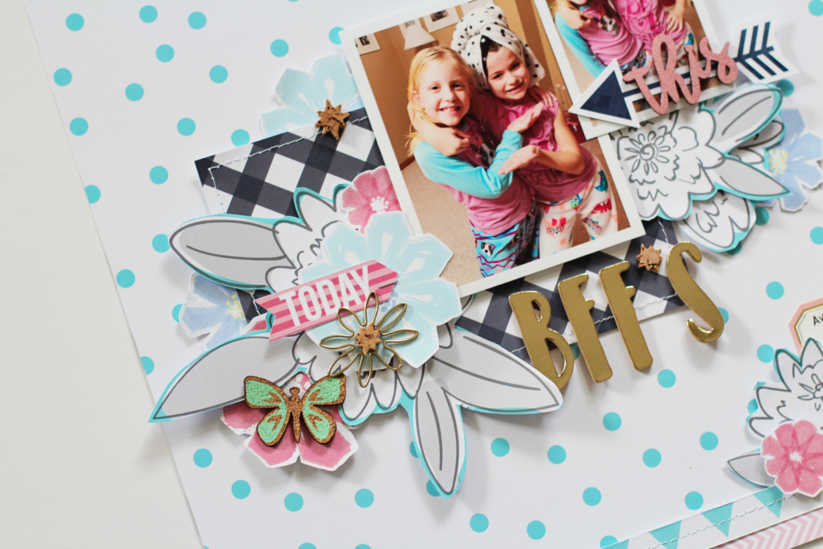 I also love how well the patterns in the collection coordinate with each other, making pattern mixing so much easier! For this page, I layered the gray, mint, pink, and blue patterned paper piece over the rainbow dotted paper for a lovely combination. I added my photos and placed a few of the die cut stars and leatherette stickers near them for little embellishment clusters.