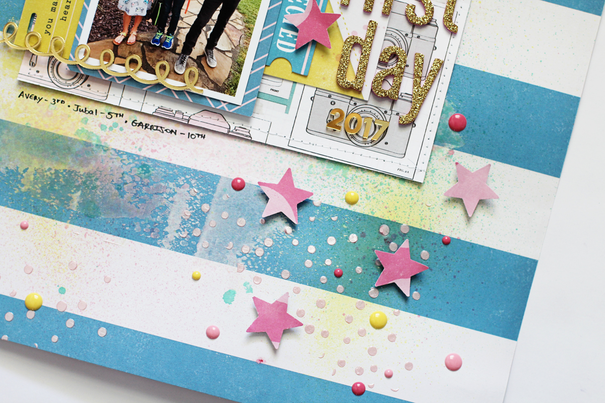 I felt like my page needed some more dimension, so I grabbed some Dazzlerz texture paste in Tutti Frutti, which is a beautiful light pink color with just a hint of shimmer, and a stencil so I could add some smaller confetti style dots around my layout. I also accented my page using some punched out stars and enamel dots to mix up the dimension and detail.