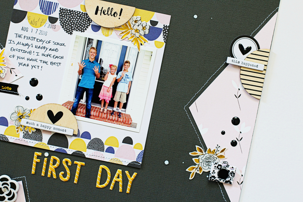 I completed my page by adding a couple of the fun Rubber Charm Stickers and placing a few of the Die Cuts and Foiled Word Icon Stickers under my title. I love how the patterned papers from the collection look like they were hand-painted and don't need much art adjustment from me, thus saving me tons of drying time!