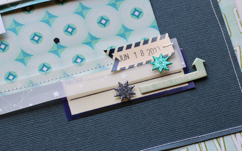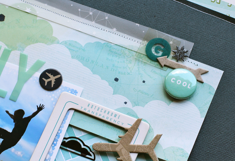 I really love the trendy travel themes, but we don't travel often and very rarely by plane, so I was stoked when I got to use the airplane chipboard pieces for this layout.