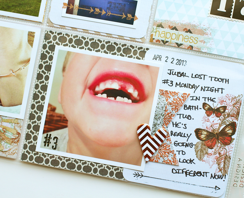 I used "A Beautiful Mess" photo app on my iPhone for the dotted border on the photo. I pulled colors from my photo for my color scheme and layered strips of patterned paper and vellum behind my photo.