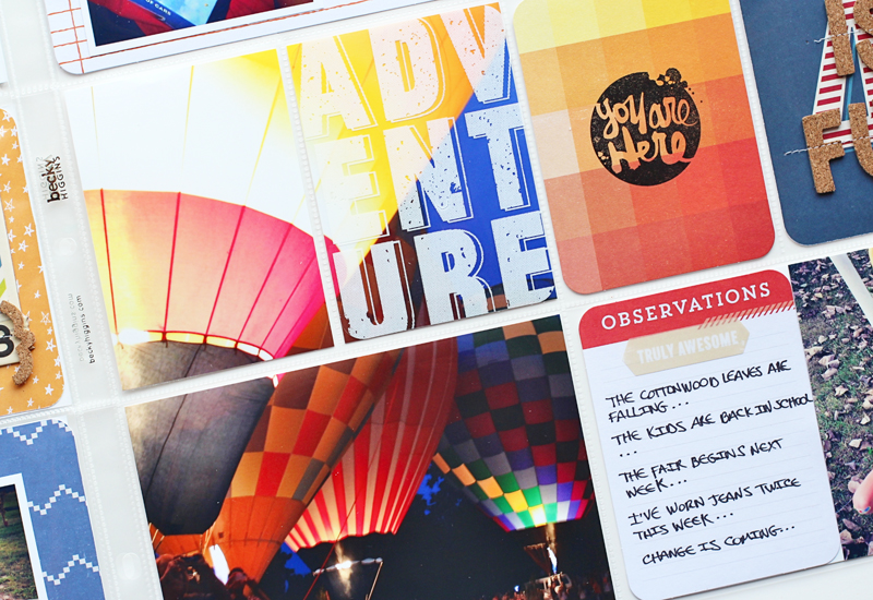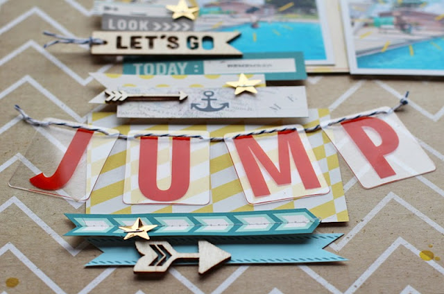 I used lots of the printables that coordinated with this month's kit, "Let's Go On An Adventure", on this layout. I layered them behind my photos and along the vertical strip that led to my title "JUMP".