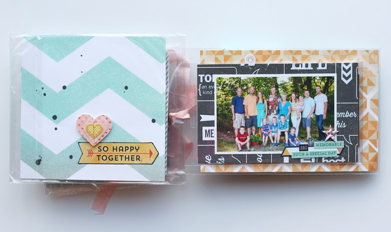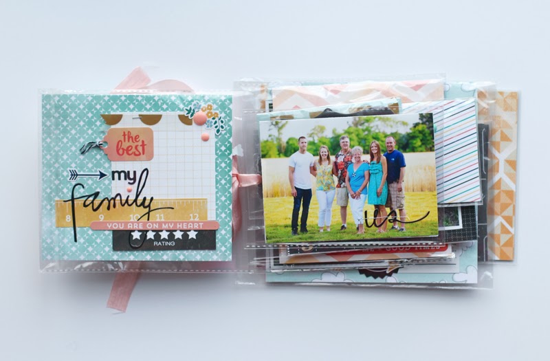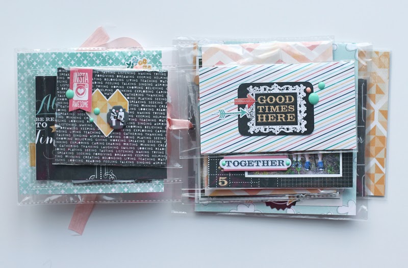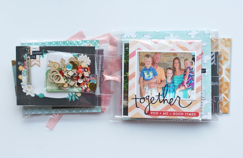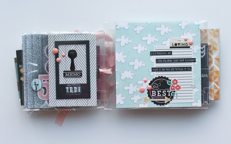 I created this mini album for the guest post I did at shimelle.com a couple of weeks ago. It's one of my favorite mini's and came together rather quickly. I used the leftover plastic sleeves that so many scrapbooking products are packaged in to contain the pages.