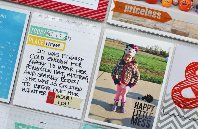 The stamps in the Exclusive October Kit were one of my favorite sets of all time, especially the "Happy Little Mess" phrase that I used on the photo of my daughter all bundled up for colder weather.