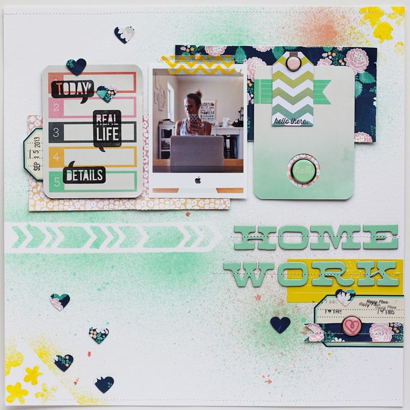 I cut out the shape I wanted to use from the chipboard packaging, positioned it on my page like a mask, and misted over the top of it using spray ink to create the arrow/chevron shape pointing to my title. I also did the same thing on the top right and bottom left corners using yellow spray ink.